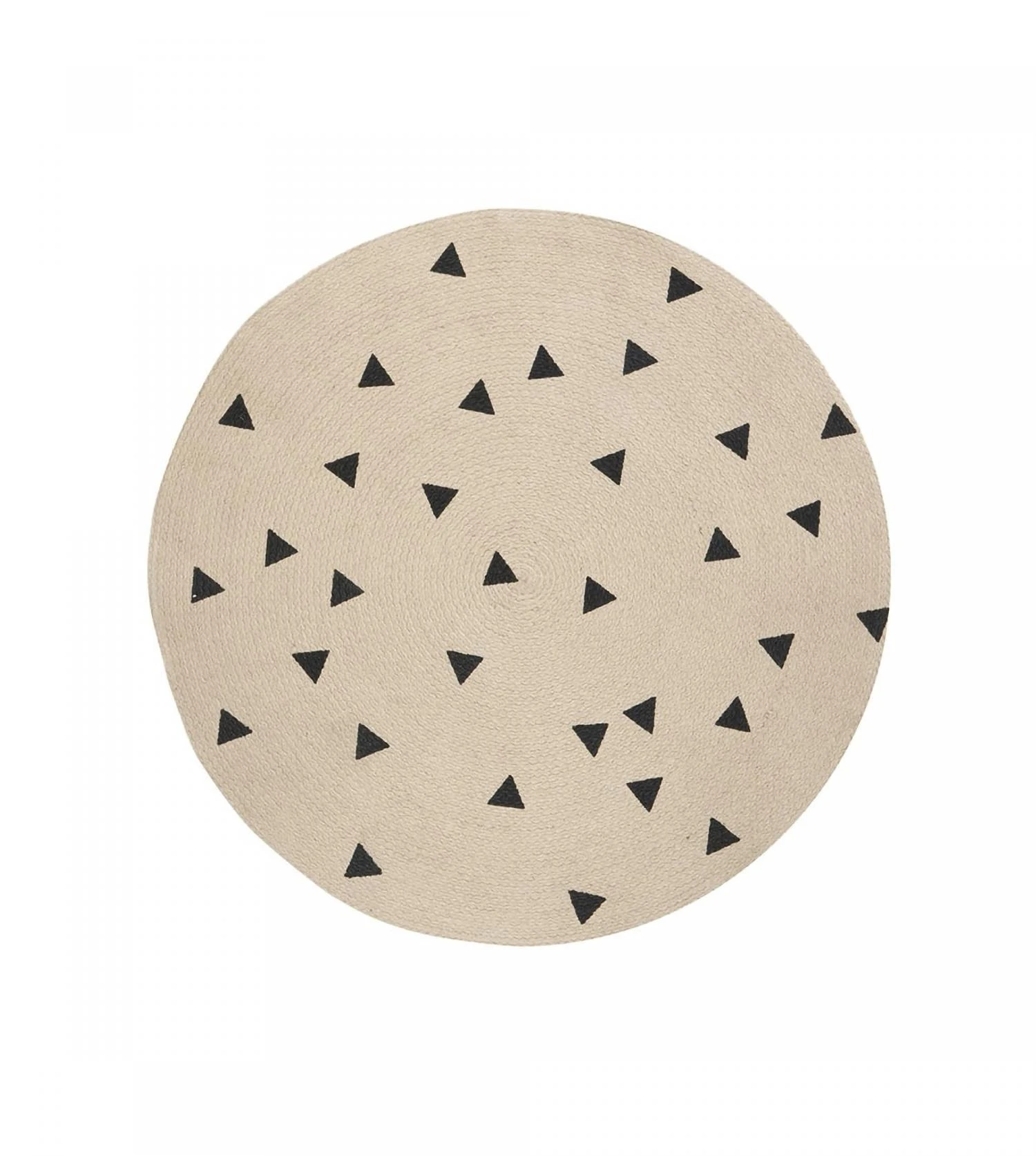 Un petit tapis rond en jute avec un imprimé graphique (pois, triangles ou batons)