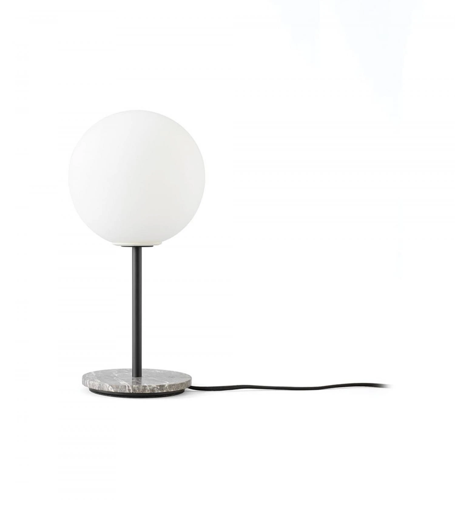Une petite lampe de table élégante et minimaliste composée d’une base en marbre et d’une tige en métal laqué noir surmontée d’un globe en verre opalescent.