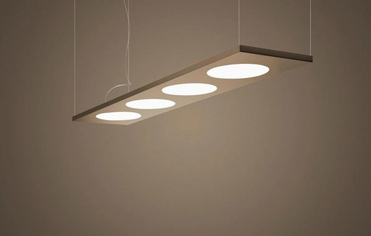 Pendant lamp géométrique dotée d’une présence visuelle forte, la suspension Dolmen Foscarini imaginée par le designer italien Ferruccio Laviani se situe à mi-chemin entre la solution d’éclairage et l’installation artistique. De style minimaliste, ce luminaire design sait comment s’y prendre pour se faire remarquer sans pour autant éclipser le décor environnant. Lampe grand format rectangulaire, Dolmen flotte dans les airs et offre un éclairage à la fois direct et indirect qui permet d’apprécier la convivialité d’un repas ou d’une soirée en famille ou entre amis autour d’une table ou dans un canapé. Ponctuée de 4 grandes découpes qui évoquent les hublots d’un navire, cette lampe design en aluminium et PMMA dotée de câbles de suspension en acier inox a été initialement créée dans les années 1990 avant d’être récemment équipée d’un éclairage LED, confortable et modulable, qui permet de choisir l’intensité du halo lumineux.