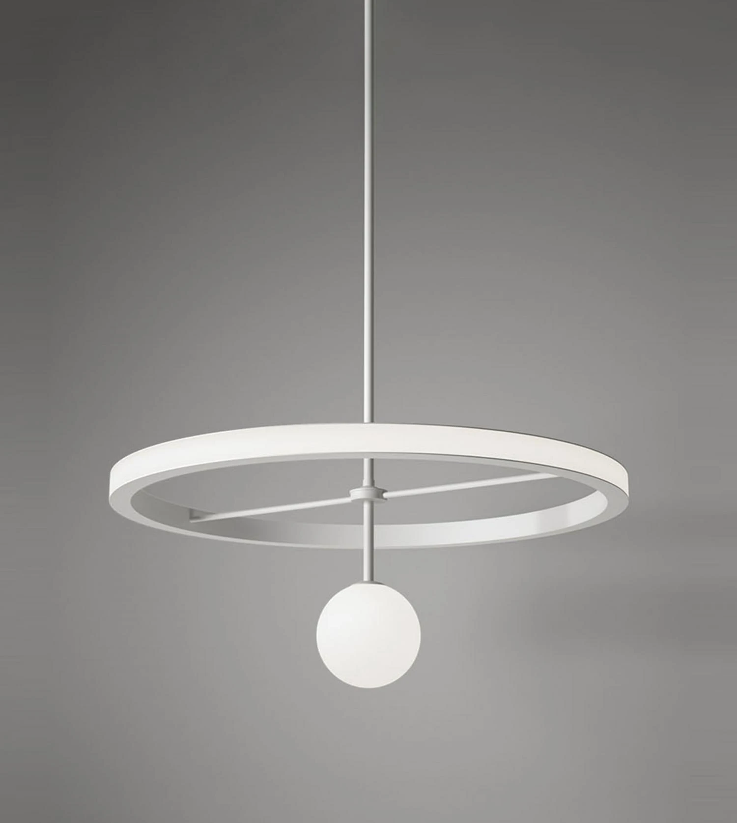 Graphique et minimaliste, la suspension Ring imaginée par la maison Atelier Areti célèbre la rondeur et le cercle. Luminaire design d’inspiration futuriste, lampe aérienne et épurée, elle conjugue élégance avec sobriété. Après avoir imaginé des suspensions qui mettent en lumière le disque plein à travers des luminaires très solaires comme la lampe Disc and Sphere (en vente chez BLOU) la marque Atelier Areti place ici l’anneau au centre de sa création. Au-dessus d’un globe en verre soufflé opalescent, unique source lumineuse de la suspension Ring, trône un anneau, une couronne en laiton ou en métal thermolaqué noir ou blanc selon les finitions choisies (voir dans caractéristiques) cerclée de blanc (finition acrylique sur la bordure extérieure pour chacune des versions proposées par l’éditeur). Grâce à sa hauteur réglable (min. 110 cm – max. 155 cm) la suspension Ring Areti possède une grande fonctionnalité et offre un confort d’éclairage optimal. Sa structure ajourée permet à ce luminaire artisanal (fabriqué à la main et à la demande) d’intégrer tout type de décor sans le masquer dans le but d’associer pleinement l’objet et le lieu. Décoration classique ou tendance, la suspension Ring s’accorde avec tous les univers. La suspension design Ring, qui trouvera sa place dans toutes les pièces de la maison de l’entrée à la chambre à coucher en passant par le salon et la salle à manger met en lumière le talent de la maison Areti qui depuis 2008 propose des pièces exceptionnelles destinées à embellir le quotidien. Baroque ou épuré, floral ou géométrique, classique ou moderne, le style Areti est pluriel et les influences multiples. Avec sa Ring pendant light Atelier Areti possède de solides arguments pour séduire les amateurs de décoration et design futuristes. Grâce à sa suspension en forme d’anneau la boucle est bouclée.